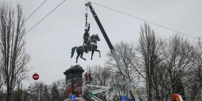 El sábado, trabajadores municipales levantaron cuidadosamente del pedestal la imponente estatua de Mykola Shchors, comandante de campo soviético durante la Guerra Civil rusa.