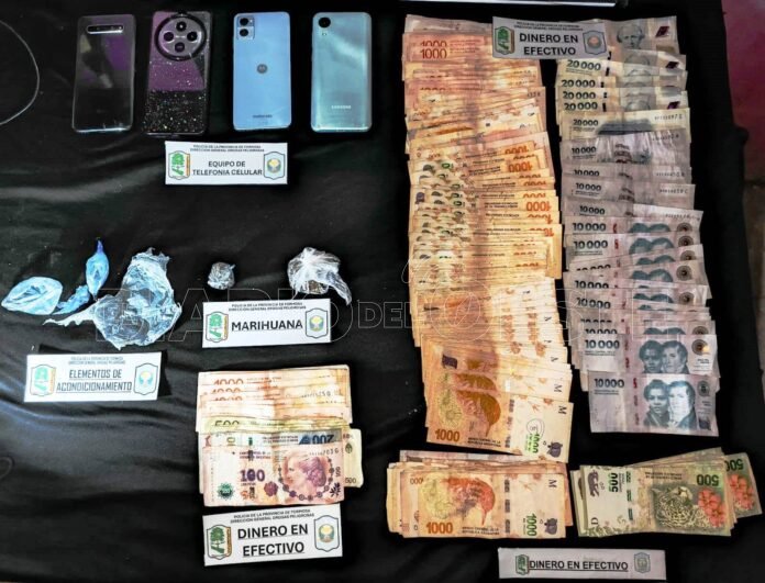 Durante la requisa domiciliaria detuvieron a dos sujetos y secuestraron marihuana, cuatro celulares, dinero y retazos de bolsas utilizadas para el fraccionamiento.