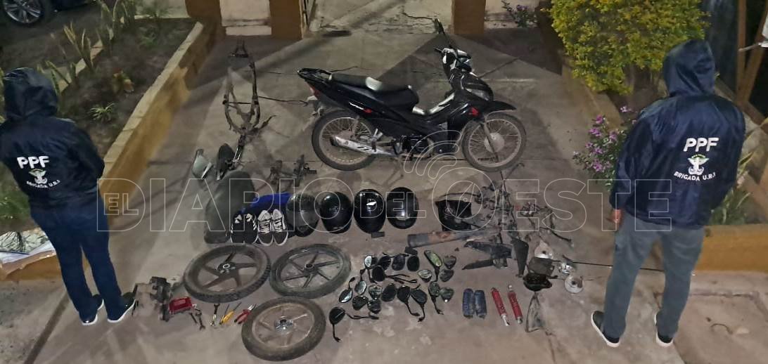 Efectivos de la brigada de investigación de la Unidad Regional Uno detuvieron a un hombre y una mujer, secuestraron más de 20 espejos retrovisores, llantas, cubiertas, plásticos, el cuadro de motocicleta adulterada, herramientas utilizadas para el desguace, cascos protectores, prendas de vestir y una Honda Wave en la que se desplazaban al cometer el ilícito.