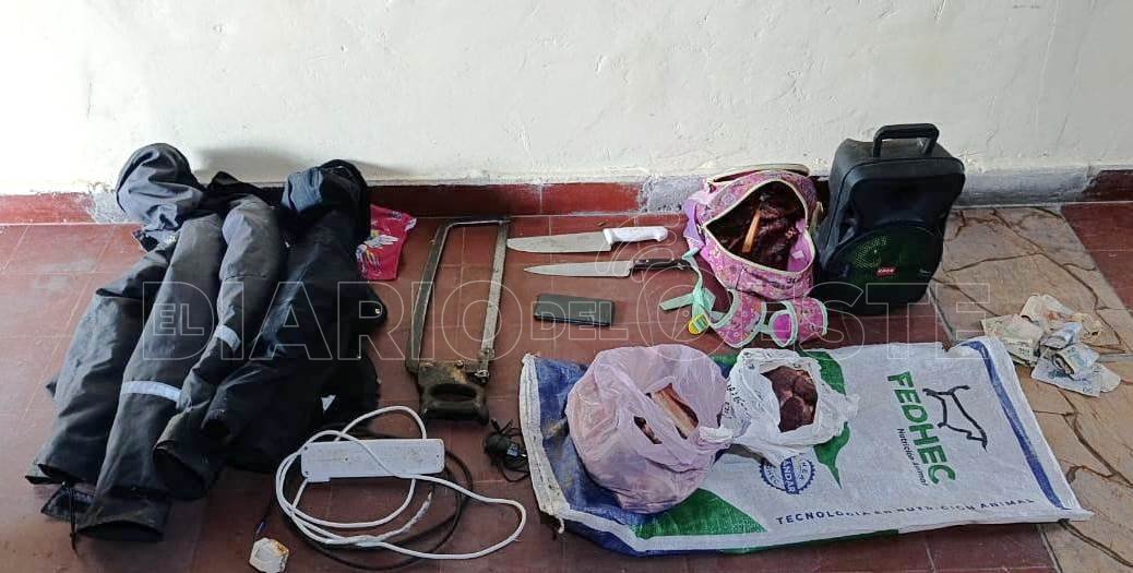 De inmediato los policías realizaron las tareas investigativas y aprehendieron a un sujeto de 34 años en la calle Girola y Primera del barrio 12 de octubre, que tenía en su poder armas blancas, producto cárnico, prendas de vestir, un equipo de sonido inalámbrico con su cargador, un celular Motorola, dinero y un alargue tipo zapatilla con cable de unos 20 metros de largo.