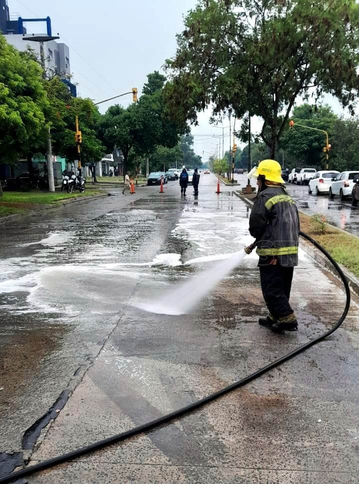 En el lugar personal del Destacamento de Bomberos del barrio San Miguel, trabajaron para el barrido y limpieza de la cinta asfáltica, para lo cual personal de la Dirección General de Policía Seguridad Vial realizó el corte del tránsito vehicular en ambas arterias, hasta que finalizaron las tareas.