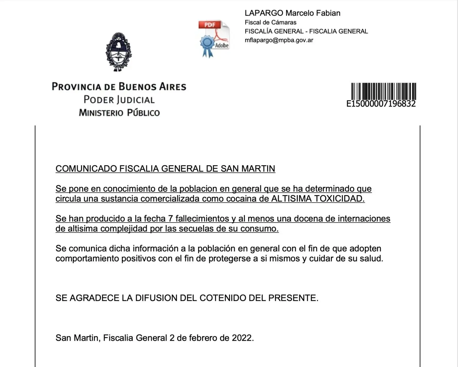 “Se pone en conocimiento de la población en general que se ha determinado que circula una sustancia comercializada como cocaína de altísima toxicidad. Se han producido a la fecha 7 fallecimientos y al menos una docena de internaciones de altísima complejidad por las secuelas de su consumo”, informó la Fiscalía General de San Martín hoy pasado el mediodía, un rato antes de que se conociera la muerte de otras tres personas.