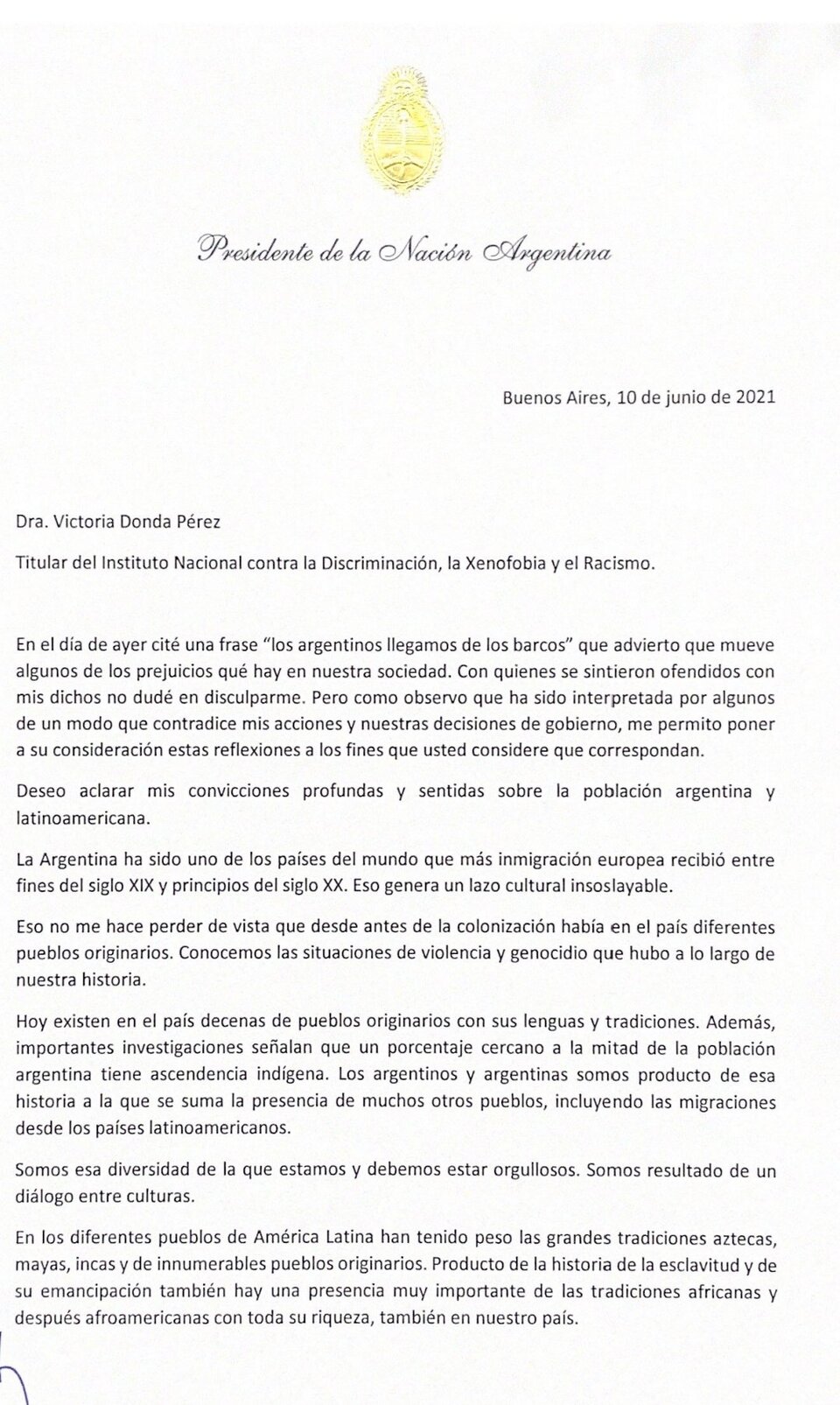 El presidente Alberto Fernández dirigió una carta a la titular del INADI, Victoria Donda, en la que volvió a pedir disculpas ante “quienes se sintieron ofendidos” por sus dichos del miércoles durante un acto con el presidente de España, Pedro Sánchez. El mandatario reconoció que la frase “los argentinos llegamos de los barcos movió alguno de los prejuicios que hay en nuestra sociedad” y se puso a disposición del organismo.