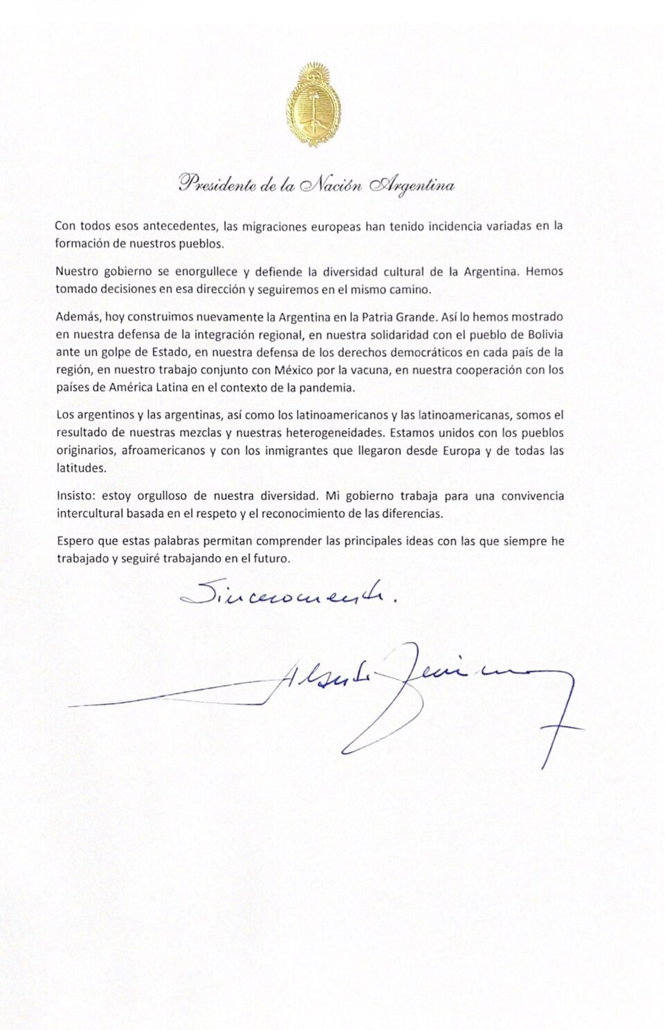 Fernández consideró que la frase “los mexicanos salieron de los indios, los brasileños salieron de la selva pero nosotros, los argentinos, venimos de los barcos” –citada de una canción de Litto Nebbia– fue interpretada de “un modo que contradice mis acciones y nuestras decisiones de Gobierno” y resaltó sus “convicciones profundas y sentidas sobre la población argentina y latinoamericana”.