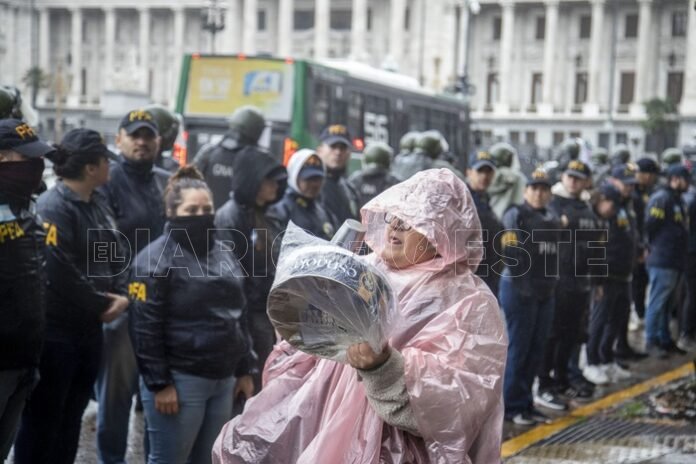 Efectivos de la Gendarmería obligaron a los manifestantes a subir a la vereda de la Plaza Congreso, donde los adultos se movilizaban guarecidos de la lluvia con paraguas y ropa de abrigo.