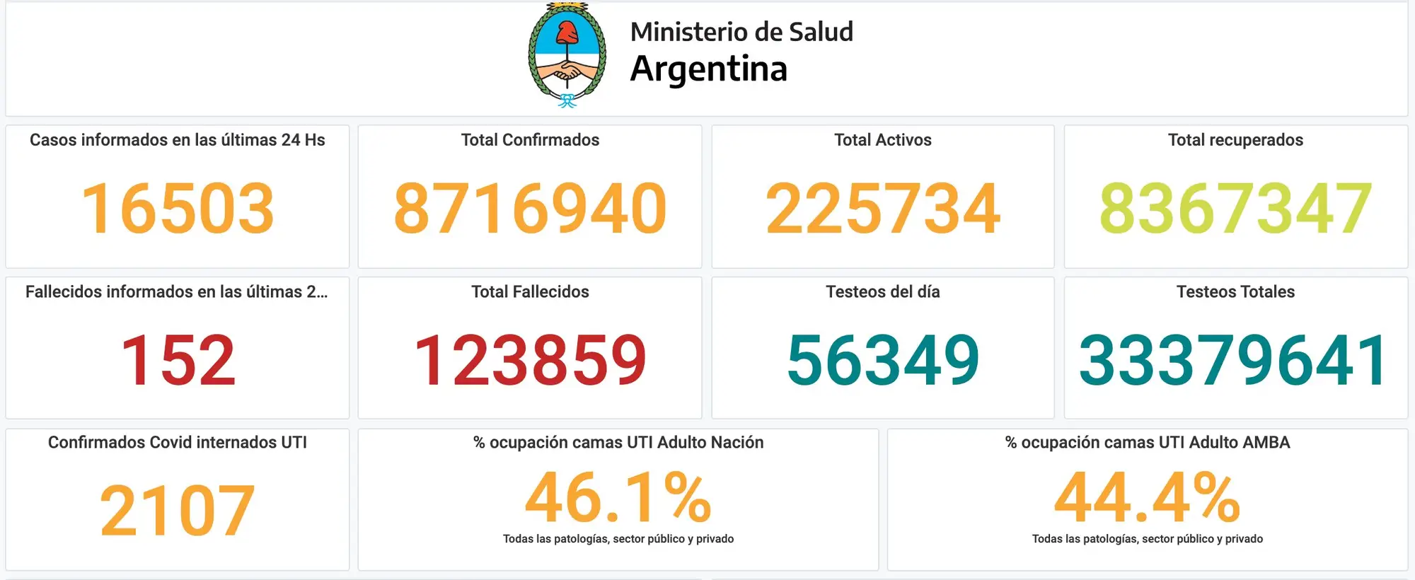 El Ministerio de Salud confirmó, en un nuevo reporte diario, que durante la última jornada se registraron un total de 138 muertes y 15.389 nuevos casos de COVID-19 a lo largo y ancho de todo el país. En total ya hay 125.062 fallecimientos y 8.815.247 contagios debido a los efectos de la enfermedad. El registro es un 6,75% menor respecto a los casos detectados el mismo día de la semana pasada, ya que el viernes pasado hubo 16.503 contagios.