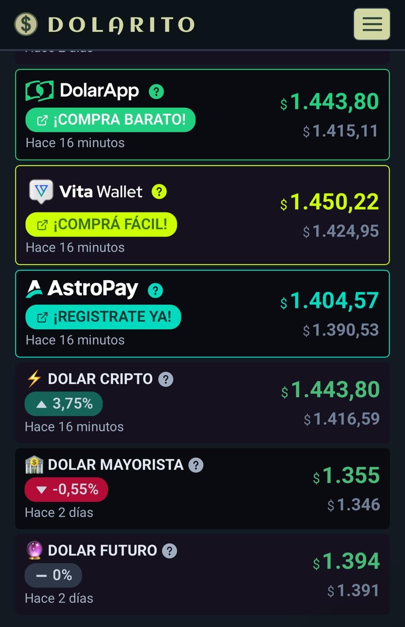 De acuerdo con el sitio Dolarito, que nuclea el valor de diversos sitios, bancos, y tipos de divisas, el valor más alto de la versión cripto la tuvo la billetera virtual “Vita Wallet”, una fintech que permite a empresas y personas enviar pagos internacionales. Su valor tocó los 1450 pesos.