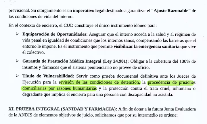 En su presentación, los represores no escondían cuál era el verdadero objetivo de la movida. Señalaban que la declaración de discapacidad debía “servir como prueba documental definitiva ante los jueces de ejecución para la revisión de las condiciones de detención, la procedencia de prisiones domiciliarias por razones humanitarias y la protección contra el trato cruel, inhumano o degradante que implica el encierro para una persona con discapacidad no asistida”.