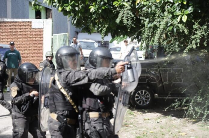 Según la versión policial, los manifestantes intentaron ingresar al Palacio Municipal y arrojaron piedras contra los efectivos que custodiaban el lugar. Los policías respondieron con balas de goma y gases lacrimógenos.