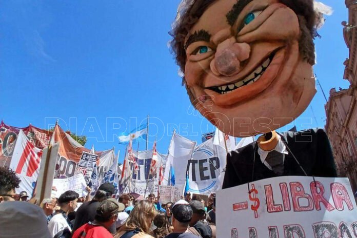 La imagen del día fue un muñeco gigante con la cara del presidente colgado de un cartel que decía “Milei: menos $Libra, más libros”, un mensaje claro contra las prioridades económicas del libertario, quien insiste en recortar ayudas sociales mientras la inflación devora los ingresos.