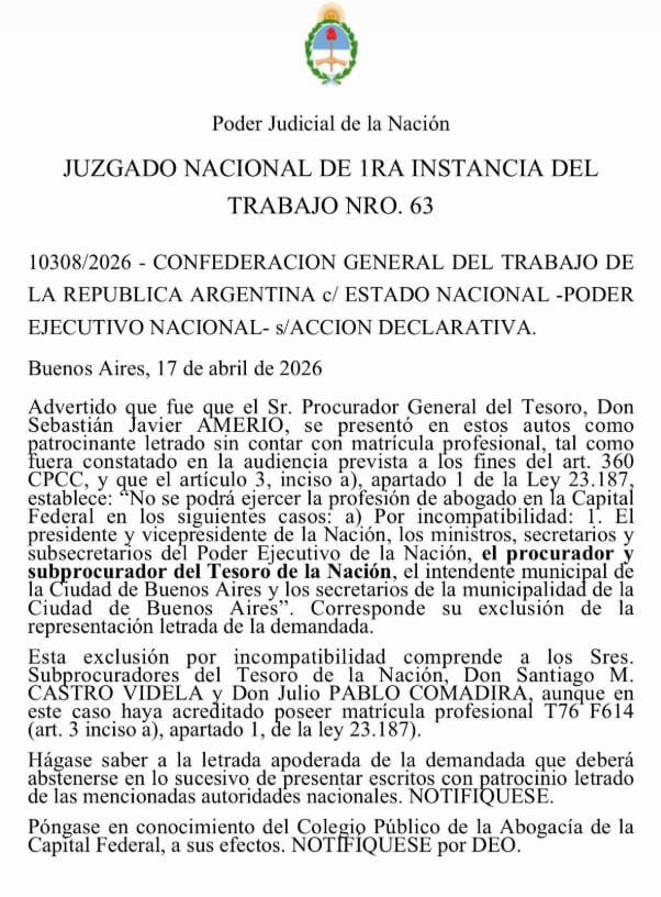 A partir de esa doble objeción -falta de matrícula e incompatibilidad legal-, el juez toma varias decisiones concretas. Excluye a Amerio de la representación del Estado en la causa, extiende esa incompatibilidad a los subprocuradores Santiago Castro Videla y Julio Pablo Comadira, y ordena a la apoderada del Estado que deje de presentar escritos con su patrocinio. Además, dispone la notificación al Colegio Público de Abogados de la Capital Federal.