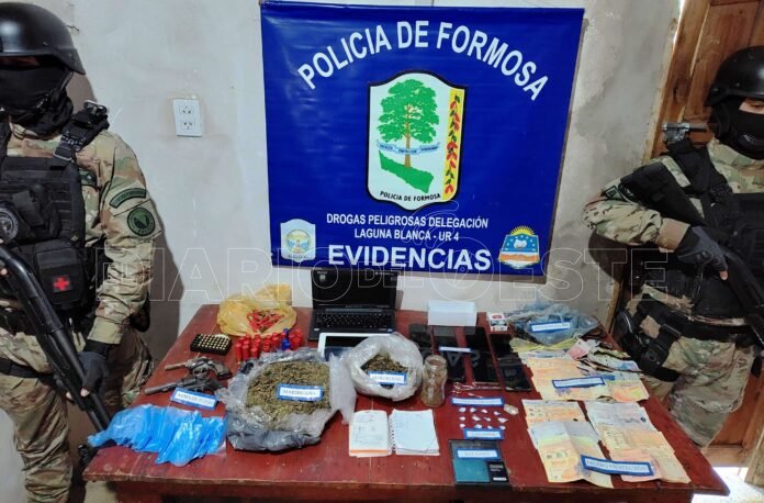 Efectivos de la Dirección General de Drogas Peligrosas, Delegación Laguna Blanca, allanaron una vivienda en la Colonia La Primavera, detuvieron a un hombre de 26 años y secuestraron marihuana, cocaína, armas de fuego, equipos de telefonía celular, dinero, balanza y otros elementos de interés para la causa.
