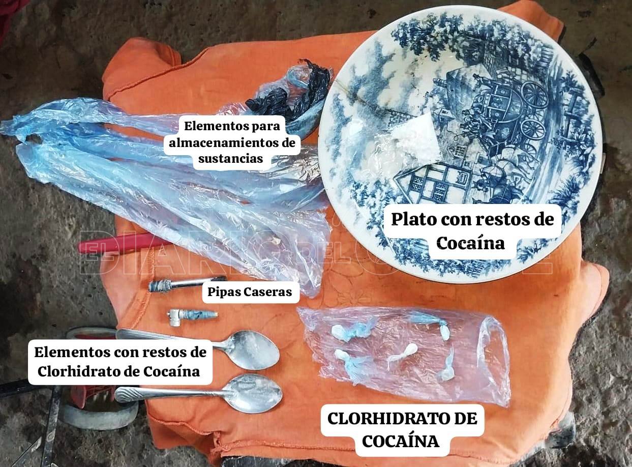 También secuestraron cinco envoltorios de cocaína, trozos de polietileno, plato con restos de sustancia blanquecina, tres cucharas, un cuchillo, dos pipas de fabricación cacera y un envoltorio con bicarbonato.