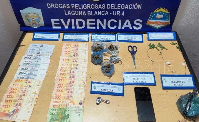 Efectivos de la Dirección General Drogas Peligrosas, Delegación Laguna Blanca, detuvieron a un hombre y secuestraron plantas de marihuana, fracciones de la misma sustancia, cocaína y otros elementos de interés.