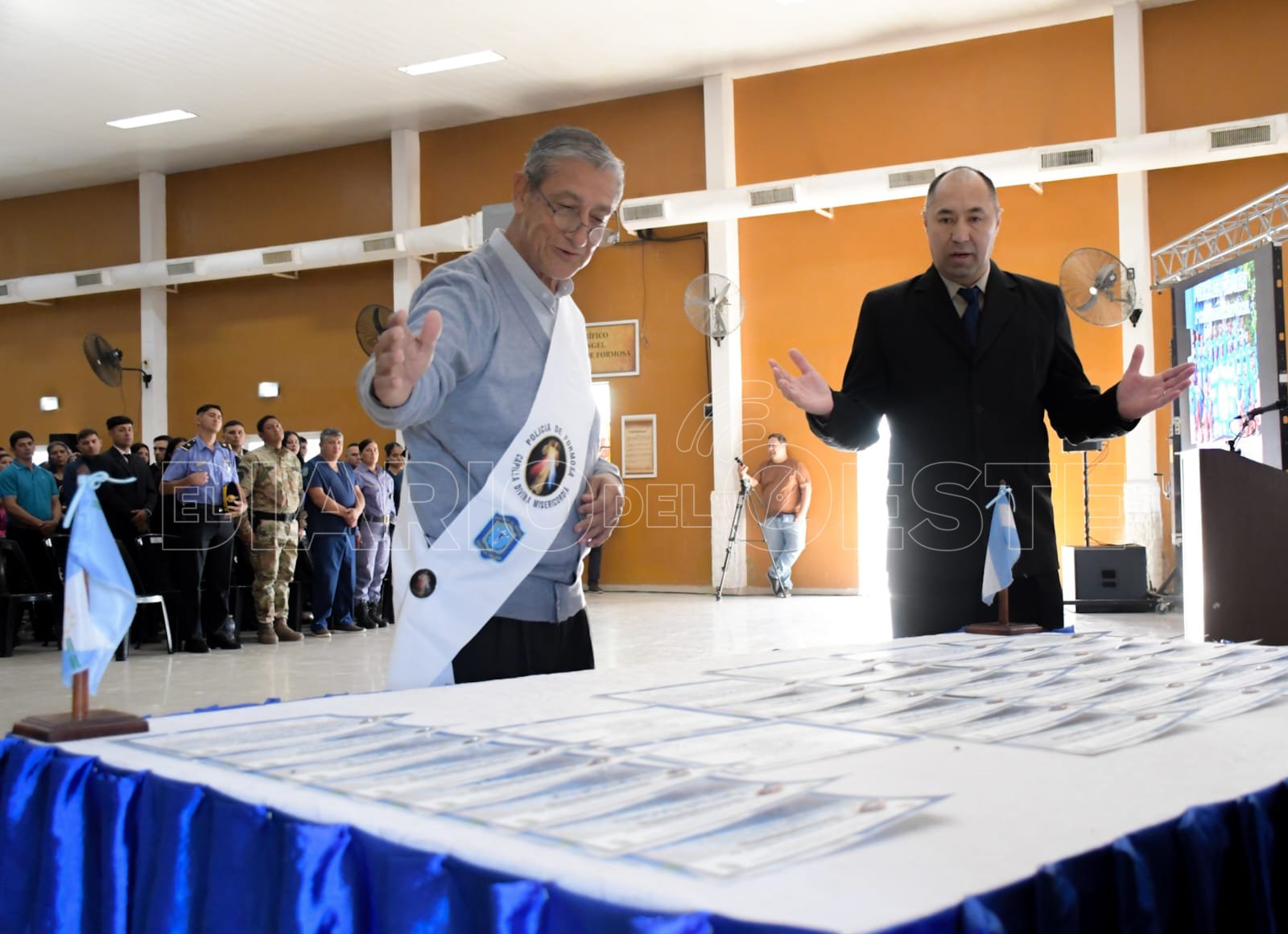 Escobar, la subsecretaria de Justicia, Comisario Mayor abogada María Higinia Sena, Comisarios Generales, integrantes de la Plana Mayor Policial, Oficiales Superiores, Jefes, Subalternos, Personal Subalterno, el diácono permanente de la Pastoral Policial profesor Roberto González, Banda de Música Policial, familiares, instructores y cursantes.