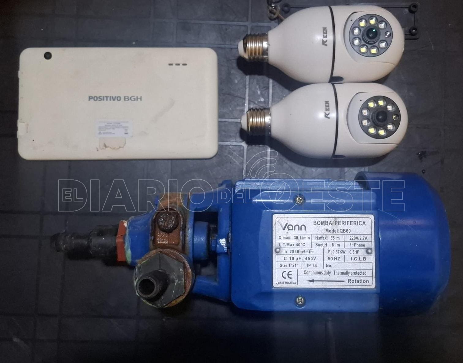 En presencia de testigos, los efectivos de la Delegación de Policía Científica documentaron la intervención, en la que se secuestraron un motor de agua de ½ Hp, dos cámaras de seguridad, tarjetas de memoria y una tablet marca BGH.