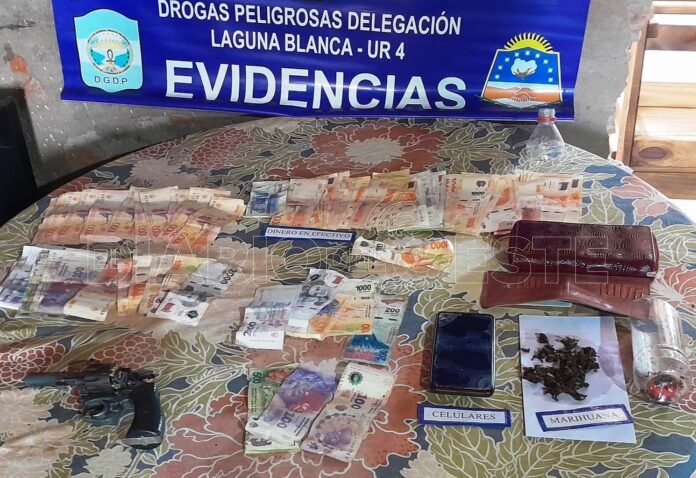 Efectivos de la Delegación Drogas Peligrosas Laguna Blanca detuvieron a un hombre, de 40 años, secuestraron envoltorios que contenían cocaína, un teléfono celular, dinero en pesos, marihuana, un revolver calibre 22 y otros elementos que confirmaron la actividad ilícita.