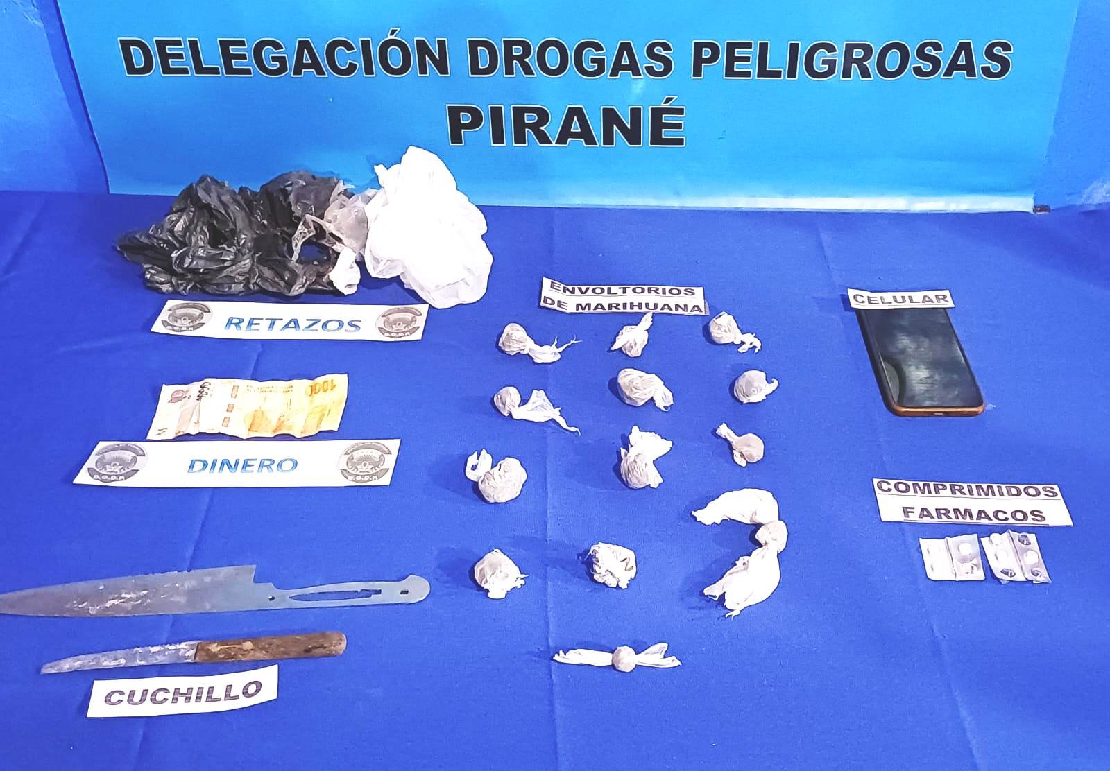 Un joven de 24 años fue detenido en la localidad de Pirané, con envoltorios de marihuana, dinero y psicofármacos, lo que derivó en un allanamiento en el barrio Ideal de esa localidad, donde se secuestraron elementos de interés en la causa.
