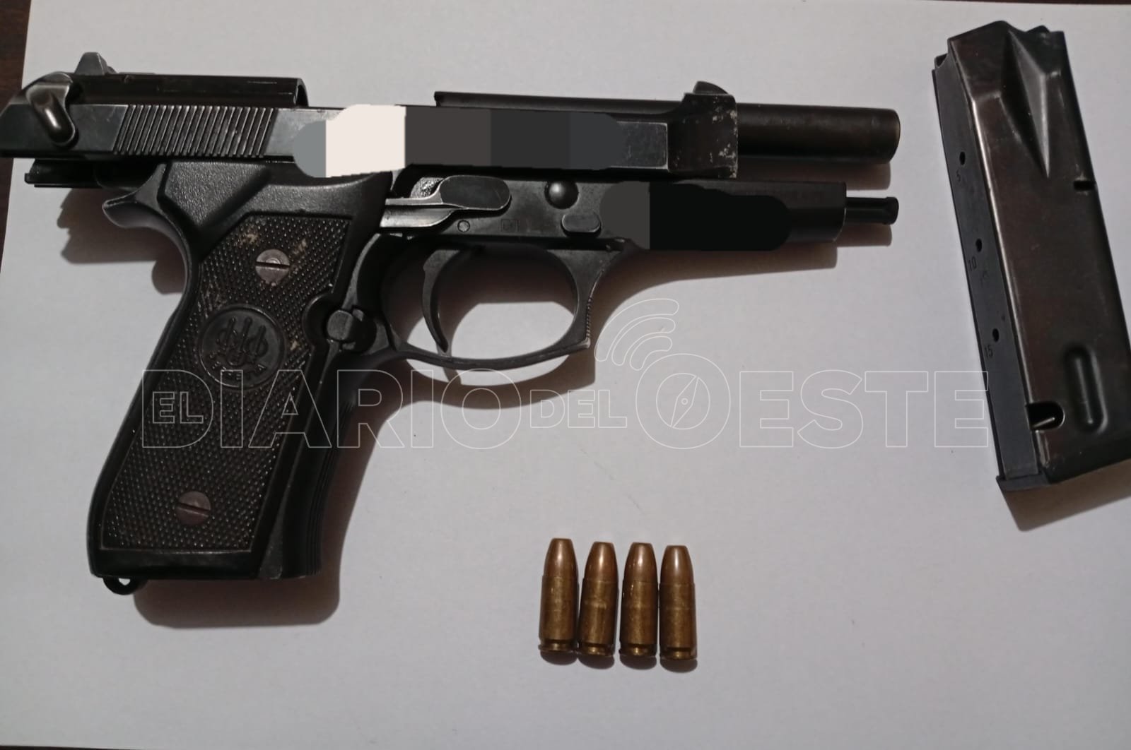 Durante la fuga, se le cayó un objeto, el cual fue recuperado por los efectivos policiales. Al inspeccionar de que se trataba, se encontraron con una pistola calibre 9 milímetros, con su respectivo cargador y cuatro cartuchos en condiciones de uso.