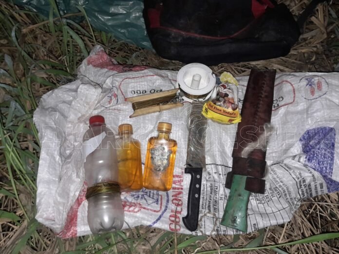 En medio de la constatación con la colaboración de la Delegación Policía Científica, secuestraron dos escopetas, cartuchos, un teléfono celular, cuchillos y bolsas, entre otros elementos.