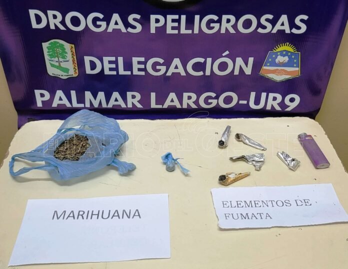 Efectivos de la Delegación Drogas Peligrosas Palmar Largo secuestraron una bolsa con marihuana, de la que se puede obtener hasta 50 dosis, elementos de acondicionamiento y otros objetos.