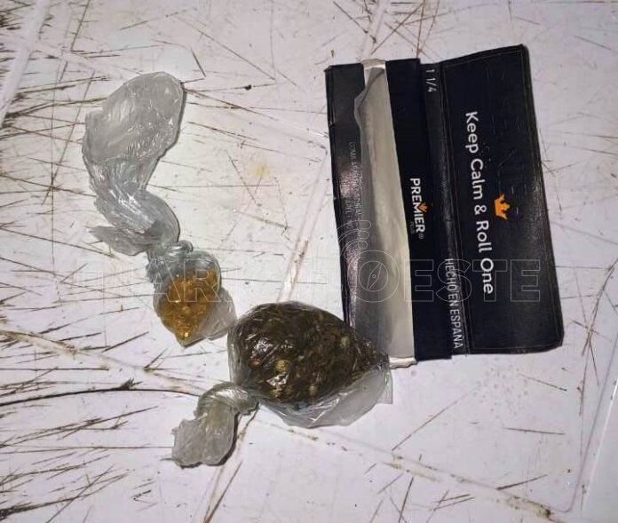 Durante el cacheo preventivo, los uniformados hallaron entre sus prendas de vestir dos envoltorios con una sustancia vegetal.