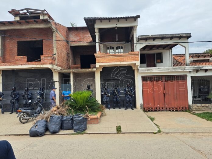 El mega operativo se realizó en la mañana de este martes alrededor de las 08:00 horas y fue llevado adelante por investigadores del Departamento Informaciones Policiales (D-2) y el apoyo de integrantes del Destacamento de Desplazamiento Rápido (DDR), Grupo Especial de Operaciones Policiales (GEOP), Grupo Intervenciones Especiales (GIE), la Dirección General de Drogas Peligrosas, Unidad Especial de Asuntos Rurales (UEAR) y dependencias de la Unidad Regional Tres.