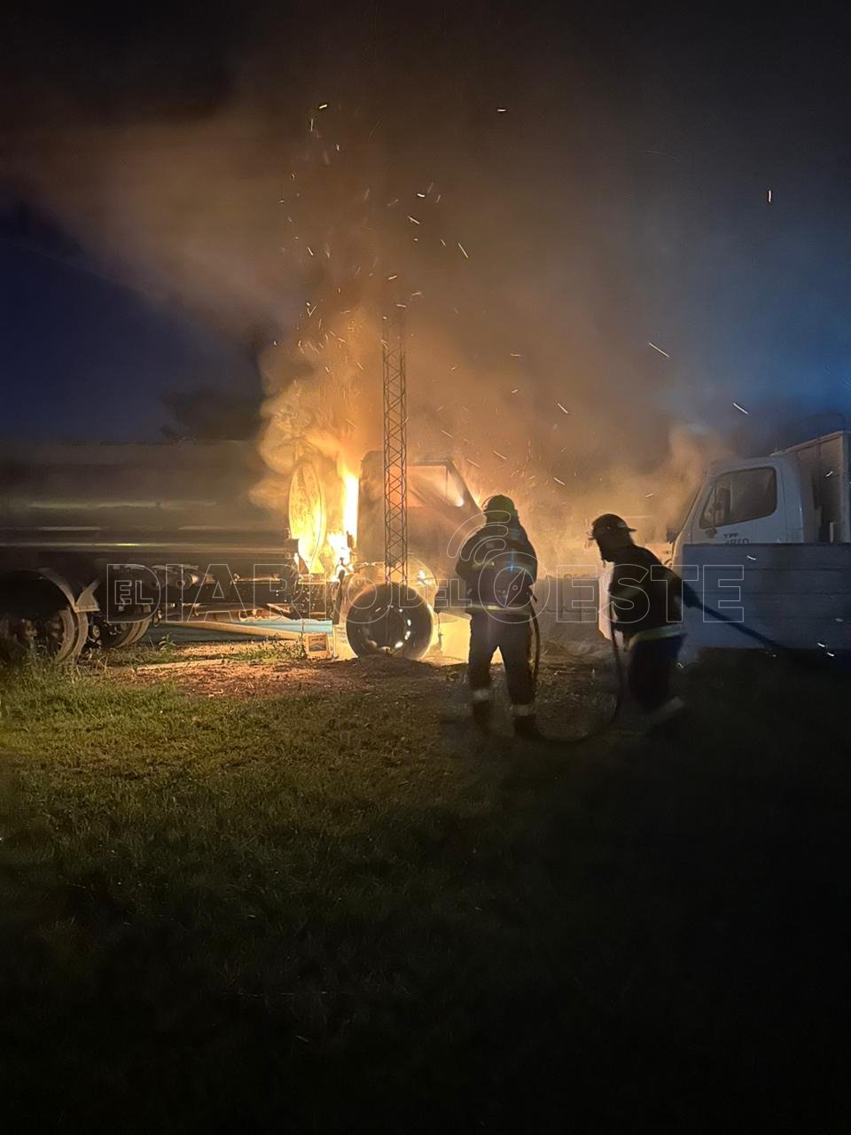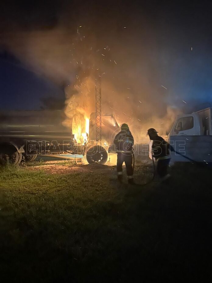 En el lugar se constató el incendio de un camión cisterna marca Volkswagen, que estaba estacionado dentro de un galpón abierto, junto a un acoplado cisterna y otros vehículos, además de bidones que contenían agroquímicos e hidrocarburos.