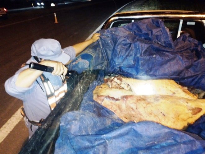 Al observar la cajuela del rodado, se constató que llevaba una carpa azul que tapaba carne vacuna de reciente faena, sin contar con documentaciones que avalen el traslado y el ingreso al ejido municipal.