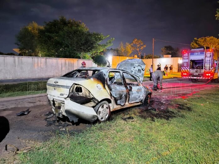 Integrantes del Destacamento de Bomberos de Pirané, extinguieron el incendio de un automóvil Chevrolet Prisma estacionado en la calle Vicente López y Planes y avenida 9 de Julio de esa localidad.